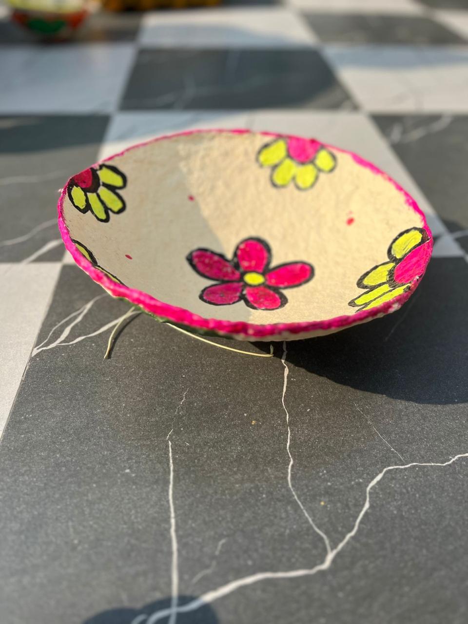 Modern Festive Brightness: This Diya takes traditional craft and injects it with contemporary vibrancy. The rustic clay base is transformed by bold, thick-line painted flowers in hot pink and glowing yellow, creating a cheerful, energetic piece of art. The bright pink rim perfectly frames the artwork. Traditionally used to hold a wick and oil for Diwali celebrations, the Diya symbolizes light and good fortune. This unique design is also perfect for adding a pop of neon, folk-inspired color to modern interiors, whether used as a small decorative dish, a vanity accent, or simply displayed as a testament to vibrant handmade craft.
