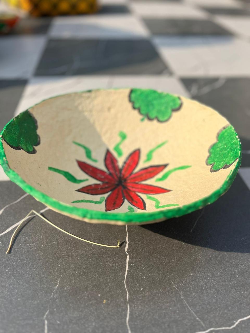 A handmade earthen lamp (Diya) or decorative bowl featuring a striking, hand-painted red star-like floral motif, surrounded by green leaf accents and finished with a bright green rim.