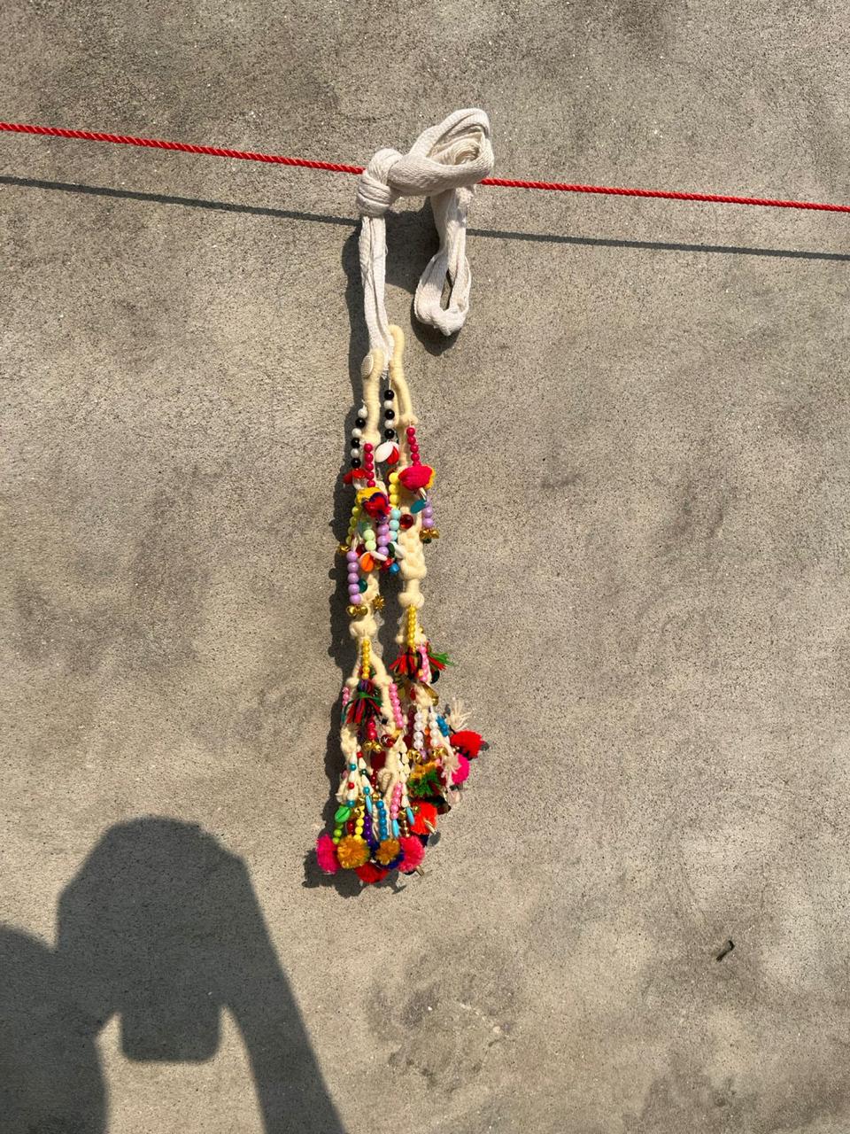 Tradition Meets Texture: This piece captures the essence of folk artistry with a focus on tactile elements. The thick, creamy white cord strap is simple and sturdy, allowing the colorful dangles to be the star. The two main strands beautifully mix rustic white beads (like wood or bone) with bursts of color from the tiny, vibrant pompoms (pink, blue, yellow) and small metallic or colored beads. This latkan provides a joyful, handcrafted touch to any space or outfit. Use it to embellish a simple tote bag, tie back curtains in a bohemian-style room, or attach it to the drawstring of a festive garment for an authentic, high-quality ethnic accent.