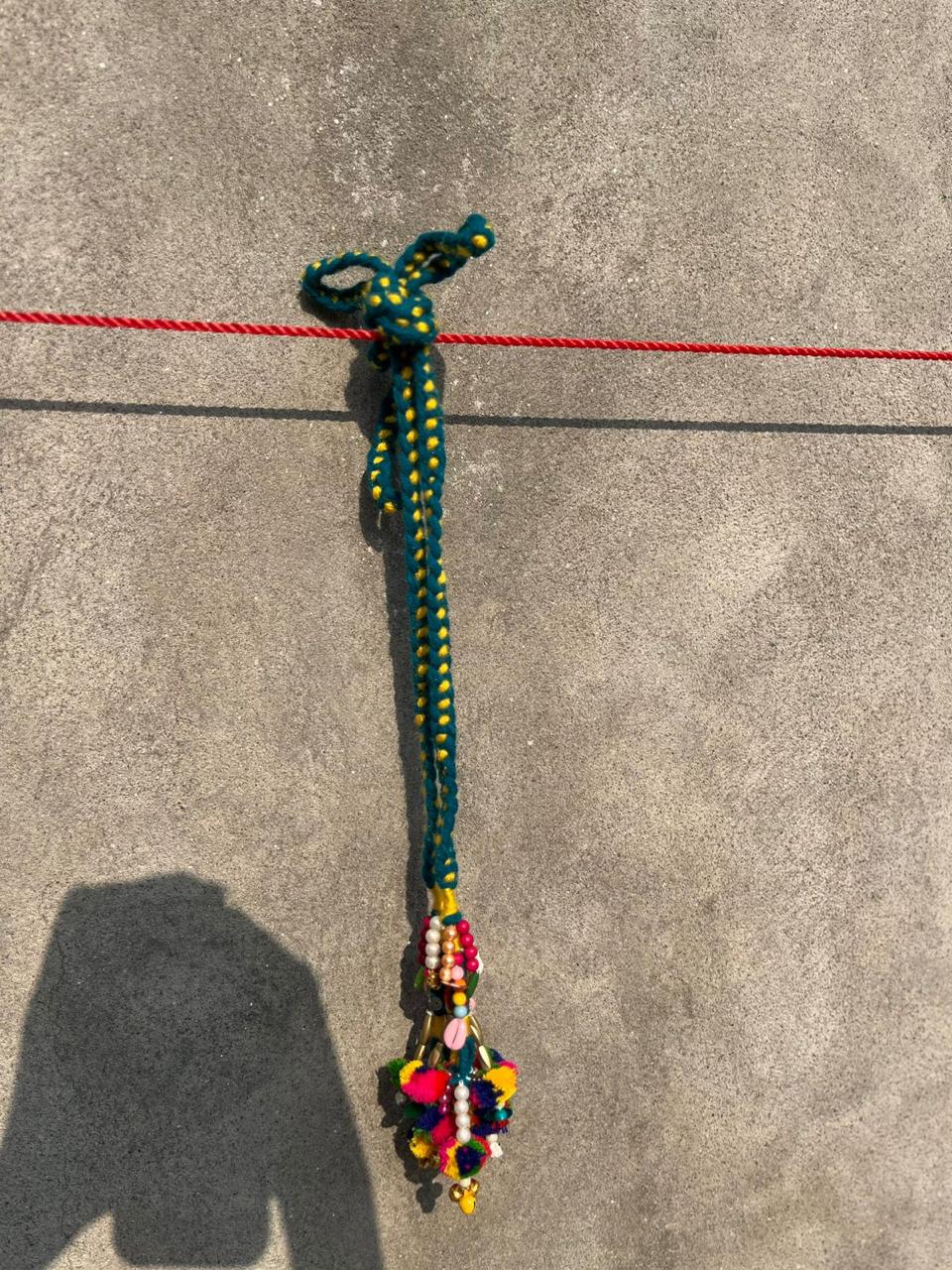 A delicate, handcrafted tie or latkan featuring a slender strap in dark green/teal with bright yellow spot accents, finished with a concentrated cluster of colorful pompoms and beads.