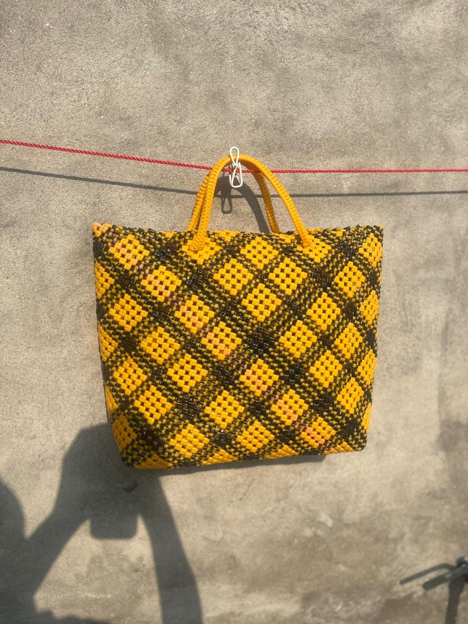 Structured Hand-Woven Plastic Wire Tote Bag – Diamond Check Yellow & Black