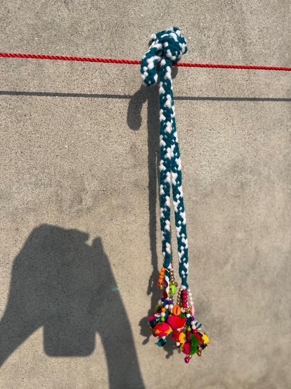 A Festive Touch of Handwork: This accessory is a delightful example of traditional thread artistry, blending a sturdy, eye-catching cord with a burst of festive color. The main strap is braided using a speckled teal (or dark green) and white pattern that feels both rustic and contemporary. The heart of the piece is the vibrant, oversized cluster of pompoms and beads dangling from the ends, adding movement and an undeniable pop of joy. This versatile latkan (hanging) is ideal for personalizing travel bags, enhancing festive outfits (like hanging from a blouse or lehenga tie), or simply bringing handcrafted cheer when looped onto a bedroom doorknob or mirror.