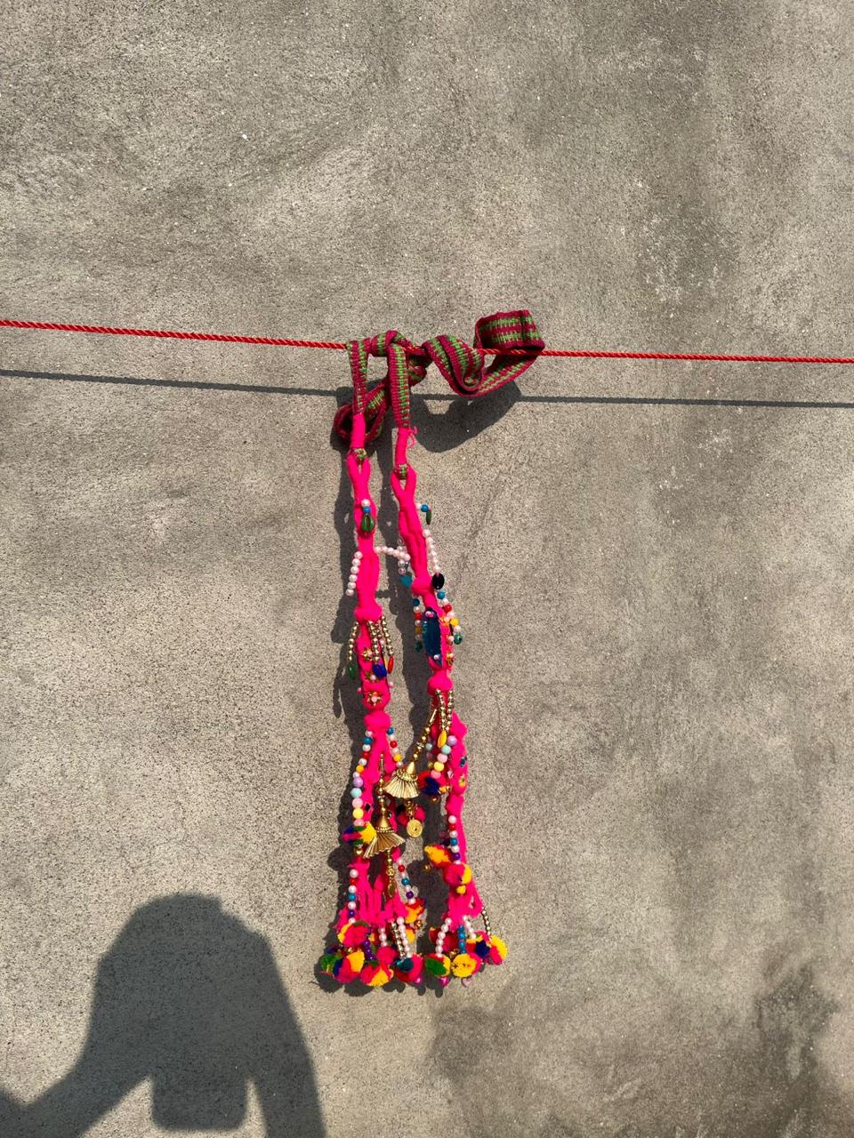 The Epitome of Festive Craft: This latkan is a maximalist celebration of color and texture, perfect for high-end festive attire and bold decoration. The foundation is a pair of thick, hand-braided bright pink cords, which are joined by a uniquely patterned secondary strap. The heavy, overflowing cluster at the base is a symphony of colors, incorporating shiny gold charms, pearlized beads, and soft, hand-rolled pompoms in every color of the rainbow. Traditionally used to elevate lehengas or sarees, this piece also works beautifully as a charismatic handbag charm, a striking curtain tie, or a spirited hanging accent for a room that loves color.